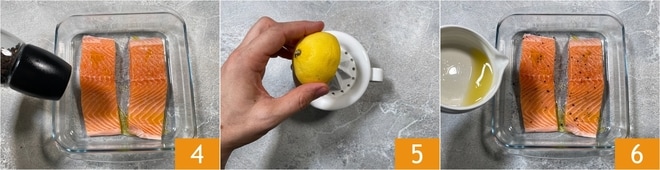 Ajoutez une pincée de poivre noir 4, pressez le jus de citron 5 et versez-le sur les filets de saumon 6