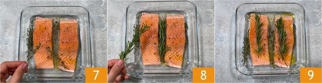 Parfumez avec des brins de thym 7 et des brins de romarin 8. Laissez mariner le saumon pendant 30 minutes, couvert à température ambiante 9.