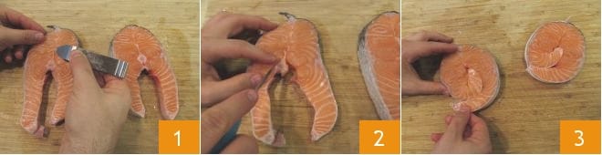 Pour cuisiner le filet de saumon au four, commencez par enlever les arêtes du poisson avec une pince 1 et vérifiez qu'il n'en reste pas en passant un doigt sur la chair. Retirez l'arête dorsale avec un couteau 2, puis enroulez une extrémité sur elle-même et entourez l'autre extrémité autour de la tranche pour obtenir un médaillon 3.