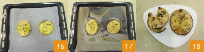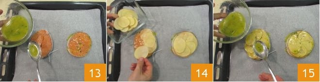 Assaisonnez les médaillons de saumon avec une partie de l'émulsion 13, puis couvrez-les avec les rondelles de pommes de terre légèrement superposées 14 et enduisez les pommes de terre avec l'émulsion restante 15.