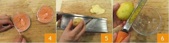 Attachez le médaillon avec une ficelle de cuisine pour qu'il conserve sa forme même pendant la cuisson 4 et transférez les médaillons sur une plaque recouverte de papier sulfurisé. Prenez une pomme de terre de forme assez régulière, lavez-la et coupez-la en fines tranches avec une mandoline, sans la peler: les tranches doivent avoir une épaisseur maximale de 1 mm sinon elles ne seront pas assez cuites 5. Maintenant, préparez l'émulsion: râpez le zeste d'un citron dans un bol 6,