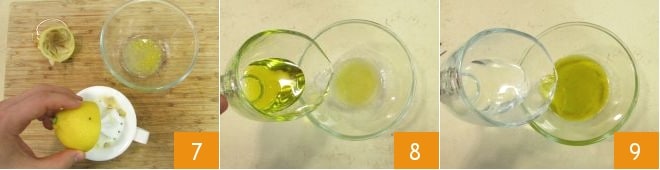 puis ajoutez 25 g de jus de citron 7, l'huile 8, le vin blanc 9,