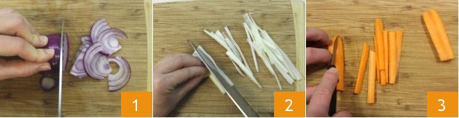 Pour réaliser le saumon en carpione, assurez-vous d'avoir acheté du saumon norvégien ; sinon, il est conseillé de le congeler pendant au moins 96 heures à -18 degrés et de le décongeler ensuite pour l'utiliser dans la recette. Ensuite, prenez l'oignon, épluchez-le et divisez-le en deux, puis placez la partie plate d'une moitié sur une planche à découper et tranchez-la dans le sens de la longueur 1. Lavez bien la branche sous l'eau courante et retirez les feuilles extérieures, celles sur les côtés et au sommet. Enlevez la membrane extérieure filamenteuse avec l'économe. Divisez la branche en deux et coupez-la en fines lamelles 2. Épluchez la carotte, puis coupez-la en fines bandes dans le sens de la longueur 3.