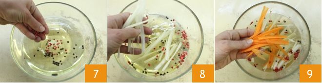 ajoutez le poivre rose et le poivre noir en grains 7 et versez dans la marinade les légumes coupés en lamelles : le céleri 8, la carotte 9