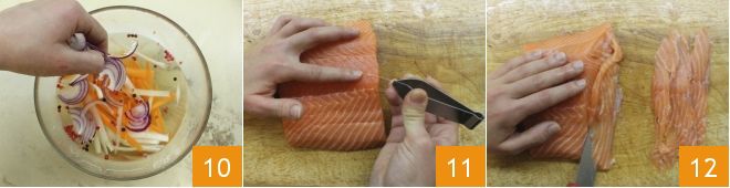 et l'oignon 10, mélangez avec une cuillère en bois pour parfumer les ingrédients. Maintenant, occupez-vous du saumon : il est essentiel que le saumon soit frais et assurez-vous surtout auprès de votre fournisseur qu'il ait été "abattu", c'est-à-dire congelé à la bonne température. Nettoyez le filet en éliminant les arêtes avec une pince de cuisine 11 et coupez ensuite le saumon en fines lamelles 12.