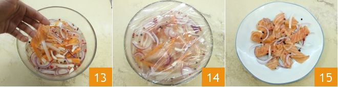 Versez les morceaux de saumon dans la marinade 13, couvrez le bol avec un film plastique 14. Laissez mariner le saumon au réfrigérateur pendant au moins 2 heures. Une fois le temps écoulé, le poisson aura absorbé les arômes de la marinade et vous pourrez déguster votre saumon en carpione avec julienne de légumes 15.