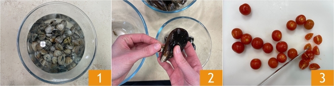 Pour préparer le sauté de moules et palourdes, commencez par mettre les palourdes dans de l'eau salée et laissez-les tremper pendant un ou deux heures 1. Égouttez les palourdes et rincez-les sous l'eau courante, puis tapotez-les une à une sur une planche à découper pour vérifier la présence de sable et éliminer celles qui sont cassées. Après le Comment nettoyer les palourdes, passez au Comment nettoyer et ouvrir les moules : rincez-les sous l'eau courante, puis retirez le byssus des coquilles 2 et frottez-les bien avec une laine d'acier ou une brosse rigide. Enfin, coupez les tomates cerises en quartiers 3.