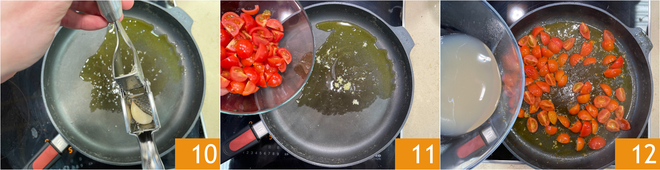 Dans la même poêle, versez un filet d'huile et écrasez les gousses d'ail 10. Laissez-les parfumer brièvement, puis ajoutez les tomates cerises 11 et faites revenir à feu doux pendant 1-2 minutes. À ce stade, versez le liquide de cuisson des mollusques 12 et poivrez selon votre goût.