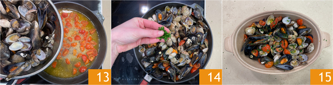 Ajoutez ensuite les moules et les palourdes 13 et laissez-les s'imprégner des saveurs pendant quelques minutes. Éteignez le feu et parfumez avec du persil haché 14. Votre sauté de moules et palourdes est prêt à être servi, garni d'un peu de persil frais 15 !