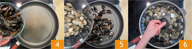 Maintenant, chauffez bien une grande poêle, puis ajoutez les moules 4 et les palourdes 5. Couvrez immédiatement avec le couvercle 6 et faites cuire à feu vif juste le temps qu'elles s'ouvrent.