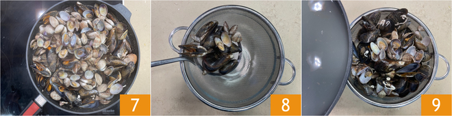 Lorsque les coquilles se seront ouvertes 7, transférez les mollusques dans une passoire 8 et filtrez le liquide de cuisson 9. Réservez.