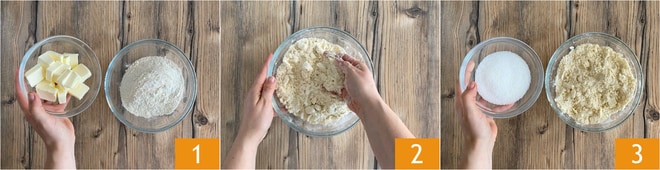 Pour préparer la sbriciolata ricotta et chocolat, versez la farine et le beurre froid en morceaux dans un bol 1. Travaillez les deux ingrédients du bout des doigts jusqu'à obtenir un effet sableux 2. Ajoutez le sucre 3.