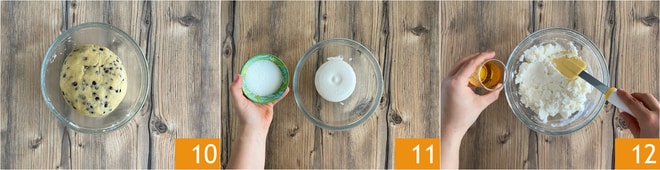 Aidez-vous en travaillant rapidement sur un plan de travail, formez une boule et laissez-la de côté à température ambiante 10, vous pouvez couvrir avec une assiette car le repos sera bref. Préparez maintenant la crème de ricotta : dans un récipient, versez la ricotta et le sucre 11, travaillez avec une spatule pour les amalgamer puis ajoutez le rhum 12 et mélangez encore pour obtenir une crème homogène.