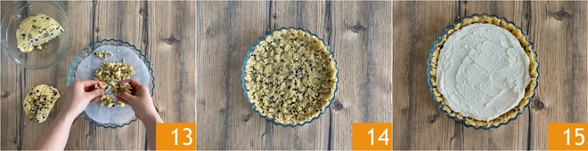 Tapissez le fond d'un moule à tarte de 26 cm de diamètre de papier sulfurisé. Émiettez la moitié de la pâte de manière grossière 13, recouvrant le fond et les bords du moule 14. Ajoutez la crème de ricotta et étalez-la avec une spatule pour l'égaliser 15.