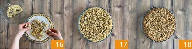 Émiettez le reste de la pâte sablée 16 jusqu'à recouvrir toute la surface 17. Cuisez dans un four statique préchauffé à 190° au milieu du four, pendant 40 minutes (la cuisson peut légèrement varier selon la puissance de votre four). Terminez la cuisson en déplaçant la sbriciolata sur la grille inférieure pour encore 10 minutes. Sortez du four 18 et laissez refroidir la sbriciolata ricotta et chocolat avant de la retirer du moule et de la découper.