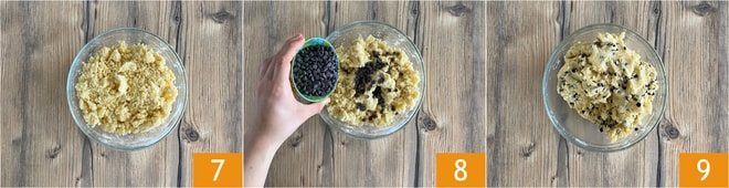 Une fois terminé 7, ajoutez les pépites de chocolat noir 8, en les incorporant rapidement pour ne pas trop chauffer la pâte 9.