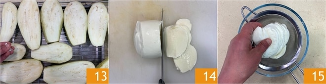 Disposez les tranches d'aubergine sur une grille sous laquelle vous aurez placé un plateau et saupoudrez-les de gros sel 13 ; laissez reposer environ 30 minutes, de cette façon elles perdront leur eau de végétation. Coupez la mozzarella en tranches 14 et laissez-la également égoutter dans une passoire 15.
