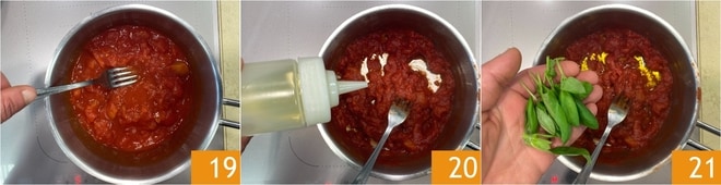 Cuisinez à feu modéré pendant environ 15-20 minutes, en écrasant les morceaux de tomate avec une fourchette 19. Quand la sauce a réduit, éteignez le feu et assaisonnez avec un filet d'huile d'olive 20, puis parfumez avec les feuilles de basilic 21 et réservez.