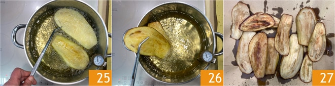 À ce stade, rincez les aubergines pour éliminer le sel 22 et tamponnez-les bien avec un torchon pour les sécher 23, puis procédez à la friture : chauffez l'huile de graines jusqu'à une température de 170° et plongez 1-2 tranches à la fois 24.