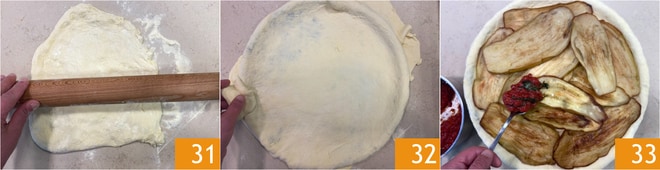 Étalez-la avec le rouleau à pâtisserie jusqu'à une épaisseur d'environ un demi-centimètre 31, puis saupoudrez la surface d'un peu de semoule et transférez-la dans un moule de 34 cm de diamètre, légèrement huilé. Tirez délicatement la pâte pour couvrir également les bords 32, puis disposez les aubergines frites à la base et recouvrez de sauce tomate 33.