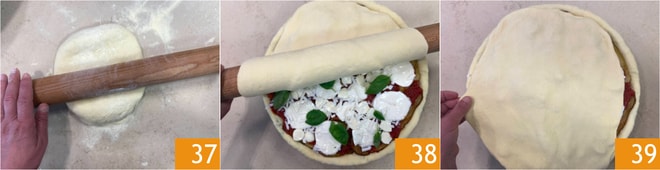 Maintenant, étalez également la seconde portion de pâte, toujours à une épaisseur d'environ un demi-centimètre 37. Saupoudrez la feuille d'un peu de semoule, enroulez-la sur le rouleau à pâtisserie et étendez-la sur le moule pour couvrir la garniture 38. Faites coïncider les bords en les tirant légèrement 39 et pressez avec le bout des doigts pour les faire adhérer.