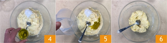 Ajoutez également l'huile 4 et l'eau restante. Attention : la quantité d'eau peut varier selon le type de farine utilisé, donc ajustez-vous en fonction de la consistance de la pâte 5. Mélangez encore avec la cuillère jusqu'à ce que le liquide soit complètement absorbé 6. Couvrez le bol avec un torchon et laissez reposer pendant 10 minutes, de préférence dans le four éteint avec la lumière allumée.
