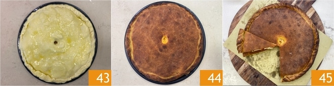 Éliminez l'excédent de pâte et retournez le bord vers l'intérieur pour le sceller 40. Huilez la surface 41 et pratiquez un trou au centre, qui servira à laisser échapper la vapeur pendant la cuisson 42.