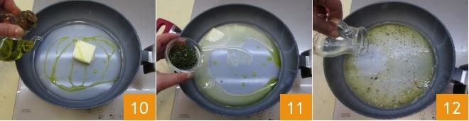 Ensuite, prenez une autre poêle antiadhésive. Faites fondre lentement le beurre avec un filet d'huile 10. Quand le beurre est fondu, ajoutez le hachis de romarin et de sauge 11. Ajoutez à ce moment le vin blanc pour déglacer 12.