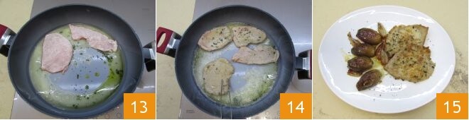 Mettez ensuite vos escalopes à cuire dans la poêle 13. Tournez les escalopes de temps en temps pour permettre une cuisson uniforme 14. Laissez cuire pendant 2-3 minutes pour bien les faire dorer. Ensuite, dressez les assiettes en accompagnant avec les échalotes caramélisées. Vos escalopes au romarin et à la sauge avec échalotes caramélisées sont maintenant prêtes à être servies et dégustées encore chaudes 15 !