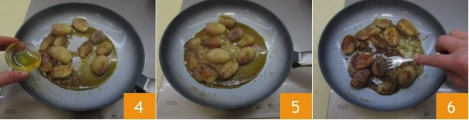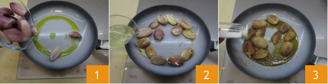 Une fois le bouillon de légumes évaporé, ajoutez le miel 4 et laissez cuire pendant 2-3 minutes supplémentaires 5, en continuant à tourner les échalotes 6 pour permettre une cuisson uniforme et que le miel s'incorpore complètement aux échalotes. Les échalotes seront donc prêtes.