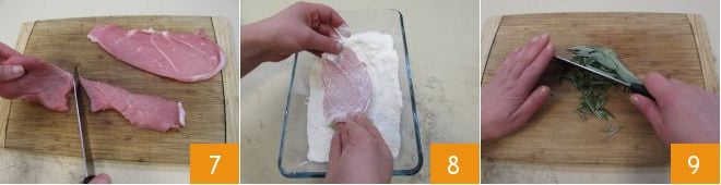 Passez maintenant à la préparation des escalopes. Placez les escalopes sur une planche à découper et découpez-les en petites tranches 7. Ensuite, versez la farine 00 dans un récipient spacieux et enfarinez les tranches de viande en les passant de tous les côtés 8. Il est important que les tranches soient entièrement recouvertes de farine. Réservez les tranches farinées sur une assiette. Ensuite, prenez la sauge et le romarin. Retirez les aiguilles de la partie ligneuse du romarin. Hachez finement la sauge et le romarin ensemble 9. Réservez le hachis d'herbes aromatiques dans un petit bol.
