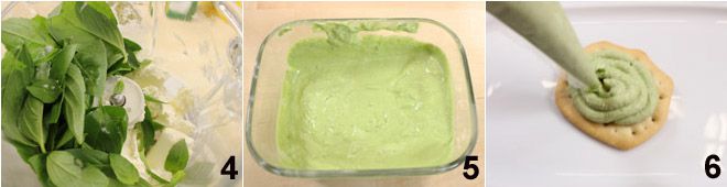 En attendant, préparez la crème en mettant dans le mixeur le basilic, la robiola et une cuillère à café de lait 4, lorsque le mélange est bien homogène 5 salez, poivrez et, à l'aide d'une poche à douille, déposez la crème sur chaque fougasse 6, décorez enfin avec les tomates cerises confites et servez.