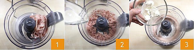 Pour préparer les schiacciate avec crème de mortadelle et pistaches, commencez par la mousse : dans le bol d'un mixeur, mixez la mortadelle 1, ajoutez la crème et le fromage à tartiner (2-3),