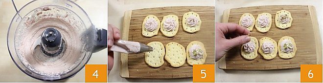 puis mixez le tout jusqu'à obtenir un mélange crémeux et homogène 4. Transférez maintenant la mousse dans une poche à douille munie d'une douille étoilée : vous êtes prêts à composer vos finger foods. Sur chaque schiacchiata, déposez une rosace de crème 5, puis garnissez avec une pincée de pistaches hachées et de poivre noir moulu 6. Voilà : les schiacciate avec crème de mortadelle et pistaches sont prêtes, très simples à réaliser et du plus bel effet !