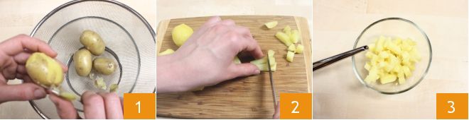 Pour préparer les focaccias avec salade de pommes de terre à l’Asiago, commencez par cuire les pommes de terre dans une cocotte-minute pendant 10 minutes. Une fois cuites, égouttez-les avec une passoire et épluchez-les 1, puis placez-les sur une planche à découper et divisez-les en deux. Découpez ensuite des petits dés 2, transférez-les dans un bol et assaisonnez-les d'huile d'olive extra vierge 3.