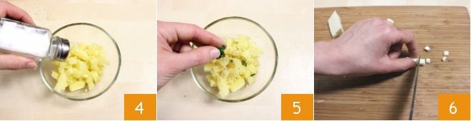 Salez et poivrez selon votre goût la petite salade de pommes de terre 4 et ajoutez également du persil haché 5. Maintenant, placez la tomme d'Asiago sur la planche à découper et après avoir formé des bâtonnets, coupez-les en dés 6.