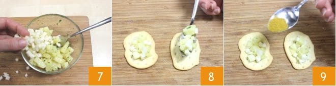 Ajoutez les dés d'Asiago aux pommes de terre 7 et disposez ensuite les focaccias croquantes sur un plateau. Assaisonnez-les en versant la salade de pommes de terre à l'Asiago avec une cuillère 8 et terminez avec une pincée de curry 9. Vos focaccias avec salade de pommes de terre à l'Asiago sont prêtes à être servies !