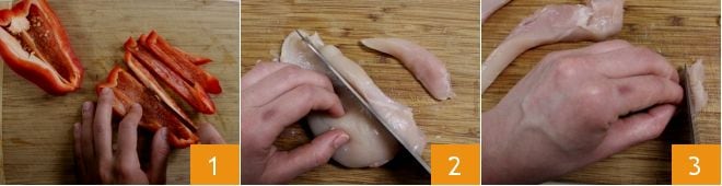 Pour préparer les schiacciate avec poulet à la paprika et poivrons rouges, commencez par les poivrons. Lavez-les sous l'eau froide courante, puis retirez le chapeau et divisez-les en deux. Prenez la quantité nécessaire à la recette, enlevez les graines et coupez-les d'abord en lanières 1, puis en bâtonnets fins d'environ 4 cm de long chacun. Rassemblez-les dans un bol. Entre-temps, prenez le blanc de poulet, éliminez les parties les plus grasses si nécessaire et coupez-le en lanières 2, puis divisez-les encore 3.