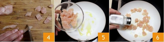 Puis découpez des petits morceaux de peu plus de 1 cm 4. Dans une poêle, chauffez un filet d'huile et ajoutez les morceaux de poulet 5. Faites-les revenir quelques instants en mélangeant pour les faire dorer de tous les côtés. Ensuite, salez à votre goût.