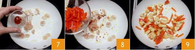 Ajoutez au poulet aussi la paprika douce (ou piquante, si vous préférez) 7 et ensuite les morceaux de poivrons que vous aviez mis de côté 8. Mélangez et cuisez à feu moyen pendant 15 minutes 9, en remuant souvent les ingrédients et si nécessaire, vous pouvez ajouter un peu d'eau pour favoriser la cuisson.