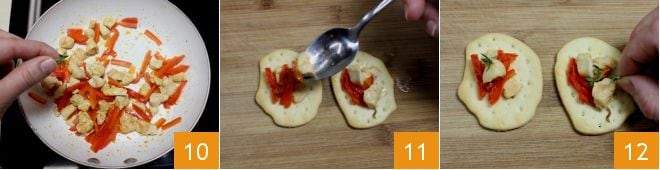 Une fois la cuisson terminée, émiettez avec les mains les feuilles de thym frais dans la poêle 10 et éteignez le feu. Laissez tiédir le poulet à la paprika avec les poivrons, puis commencez à composer vos schiacciate : aidez-vous d'une cuillère à café pour garnir chaque schiacciata 11 et à votre guise, vous pouvez ajouter encore quelques feuilles de thym 12. Servez vos schiacciate avec poulet à la paprika et poivrons rouges comme un savoureux finger food !