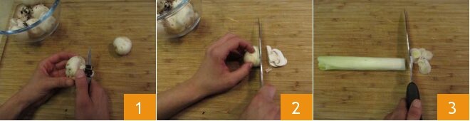 Pour préparer les sedanini gratinés au four, commencez par la nettoyage des champignons de Paris. Après avoir enlevé la base terreuse 1 nettoyez la surface avec un chiffon humide. Coupez-les en tranches 2 et mettez-les de côté. Ensuite nettoyez le poireau en enlevant les deux feuilles extérieures et en le coupant en fines rondelles 3.