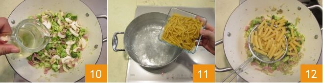 Une fois le fond bien revenu, ajustez le sel sans exagérer, déglacez avec le vin blanc 10 et laissez l'alcool s'évaporer avant de baisser le feu et continuer la cuisson pendant encore 10 minutes. Pendant ce temps, plongez les pâtes dans de l'eau bouillante salée 11, dès qu'elles sont al dente, égouttez-les directement dans la poêle 12.