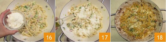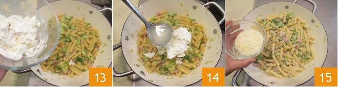 Ajoutez la ricotta 13, une louche d'eau de cuisson des pâtes et mélangez 14. Après avoir ajusté la consistance, vous pouvez éteindre le feu et ajouter le caciocavallo râpé 15