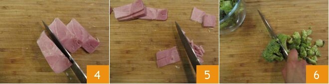Avec un couteau, tranchez le jambon cuit, vous devez obtenir des tranches épaisses d'un demi-cm 4. Ensuite, découpez ces tranches en petits dés 5. Enfin, hachez grossièrement les fleurettes de brocoli 6 et passez à la cuisson.