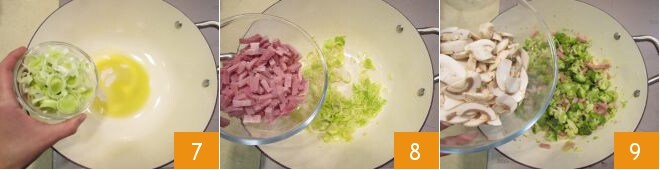 Dans une casserole, de celles adaptées au four, chauffez un filet d'huile et plongez le poireau 7 et le jambon 8. Laissez revenir quelques instants avant d'ajouter également les brocolis et les champignons 9.