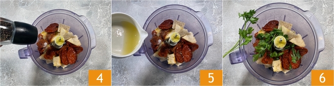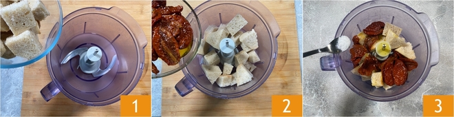 Pour préparer les seiches à la friteuse à air, commencez par la panure : dans un mixeur, combinez la mie de pain 1, les tomates séchées à l'huile égouttées 2 et le sel 3.