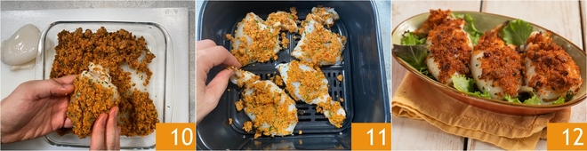 Couvrez les seiches déjà nettoyées avec la panure, en veillant à bien l'adhérer aussi sur les tentacules 10. Placez les seiches dans la friteuse à air (nous avons utilisé une friteuse d'une capacité d'environ 6 litres) et faites cuire à 160° pendant 10 minutes 11. Une fois prêtes, servez immédiatement vos seiches à la friteuse à air, accompagnées peut-être d'une petite salade fraîche 12 !
