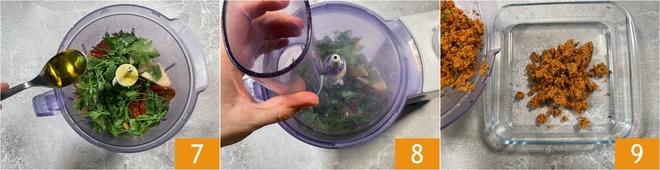 Enfin, versez l'huile d'olive extra vierge 7, fermez le mixeur et mixez le tout 8. Transférez la panure obtenue dans un plat 9.