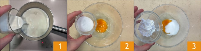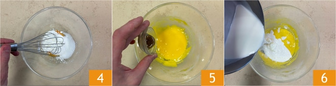 Mélangez 4 jusqu'à obtenir un mélange homogène, puis ajoutez l'extrait de vanille 5, le lait et la crème 6.